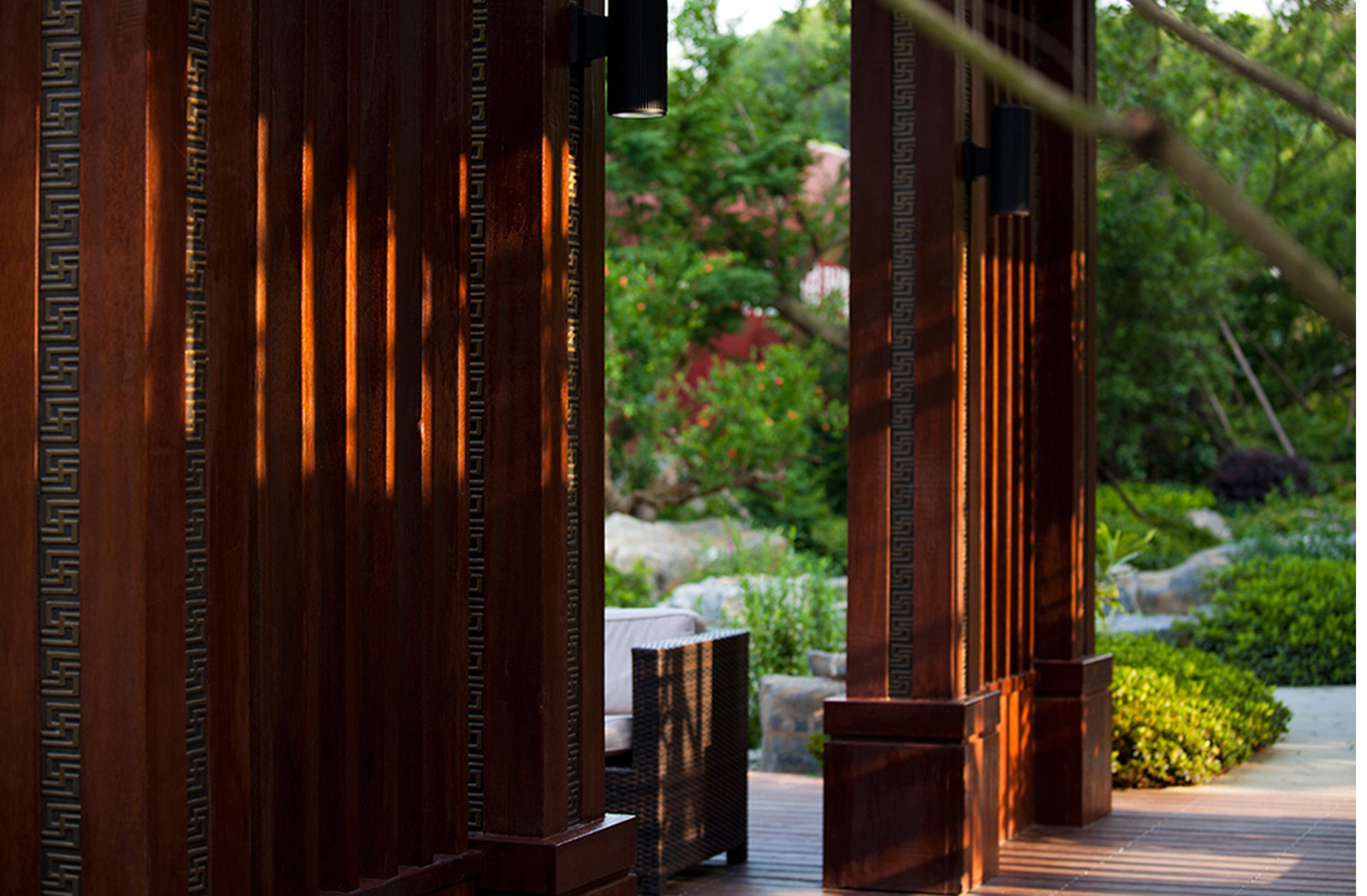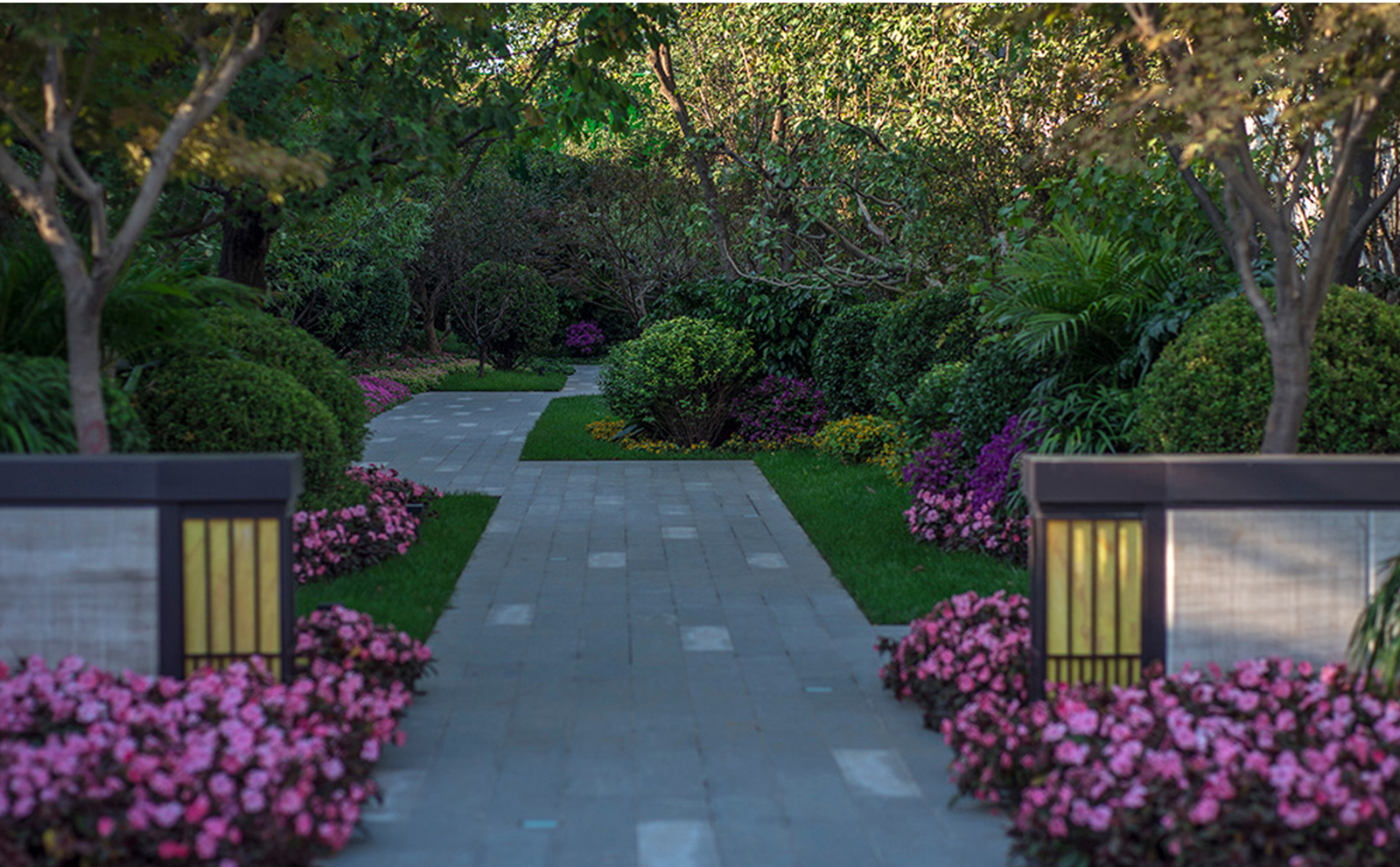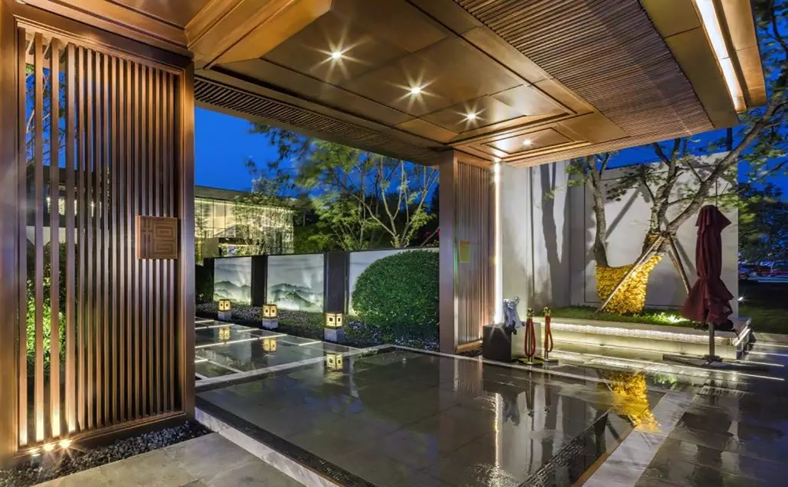 見(jiàn)禮檀園,府院初開(kāi),西入口門(mén)頭前場(chǎng)空間有限,景觀(guān)上采用 欲揚(yáng)先抑的手法,以大禮東方、神韻在心為意境,將景觀(guān)在門(mén)頭后進(jìn)一步表現(xiàn),空間組織人車(chē)分流,中軸步道以“檀” 字紋為核心,兩側(cè)以云入境,如焚檀香以籠煙,林蔭清淺,天色清雅,業(yè)主歸家自然心境平和。