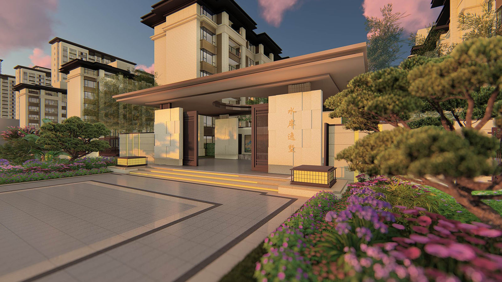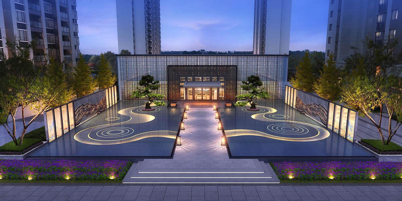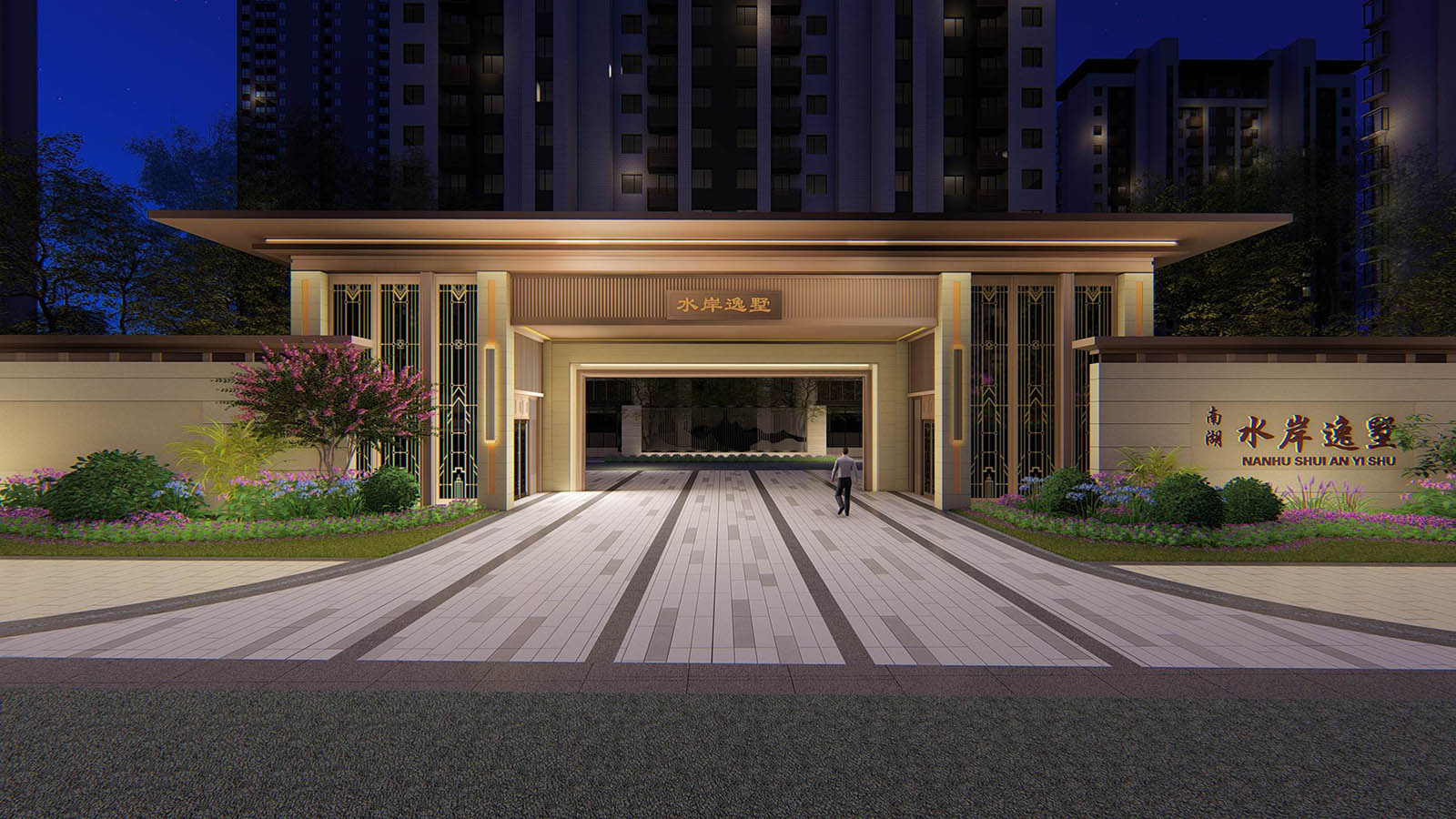 鏡面水景及景墻屏風的脈絡肌理與地塊東側的南湖相呼應,以此與南湖·水岸逸墅案名產(chǎn)生共鳴,景觀將月印萬川,處處皆圓為文化內涵具象,寓意萬川歸源,圓融無礙,精英階層的生活處事態(tài)度與精神追求。