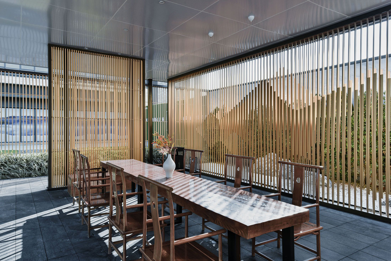 售樓部走出后園路上的對景,設置鵲影光華異形格柵景墻,優雅的光影關系,若隱若現的喜鵲小品,引導客戶進入景觀后場空間。