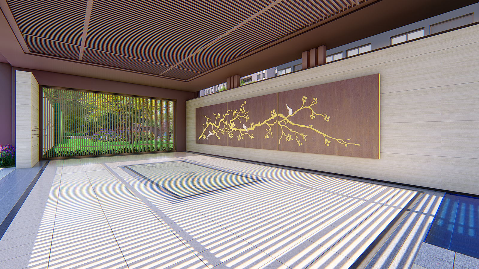“L形”廊架給予客戶無形的引導,帶領客戶進入到更深層次空間,廊架頂板布置喜鵲藝術裝置,以雀幸喜歸為主題,引導賓客進入售樓部。