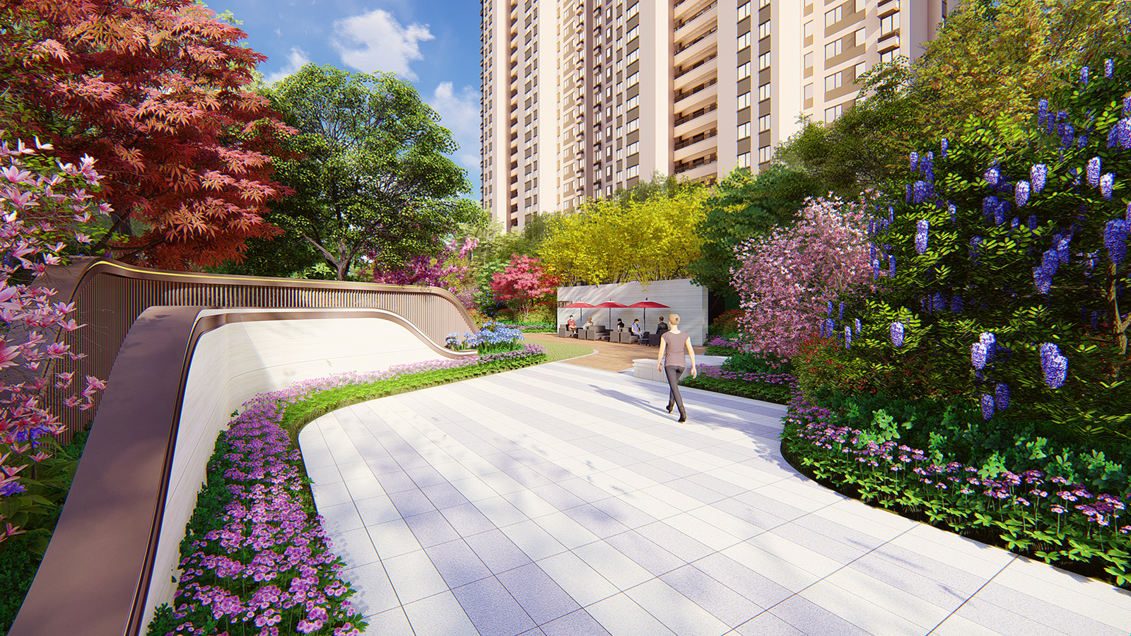 置業顧問引導客戶到達休閑平臺,空間開闊,綠植分布周圍,對景草階現代新穎,草坪上散布的藝術裝置增添景觀亮點,為客戶創造心曠神怡的身心感受,品味整個示范區的優雅品質。