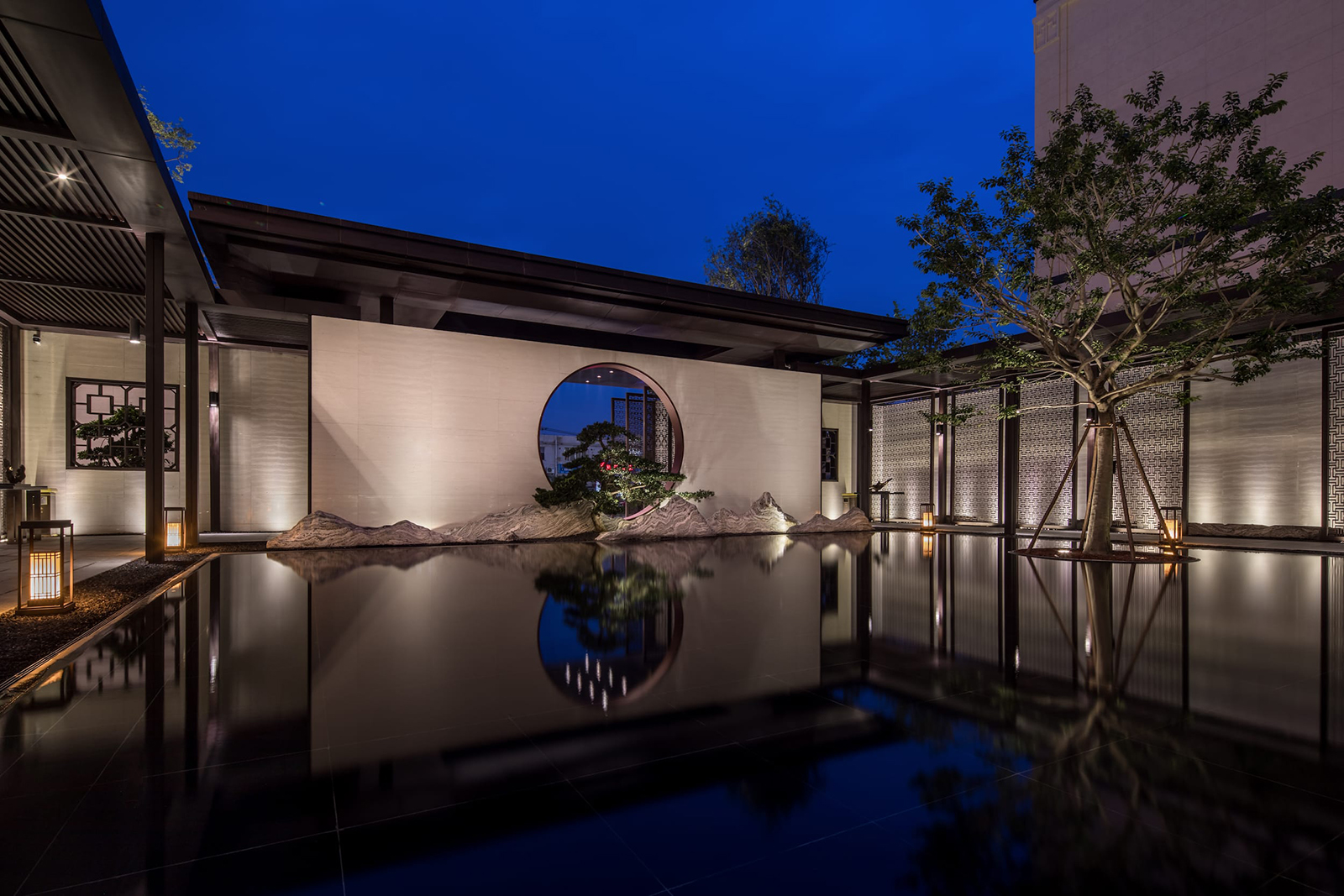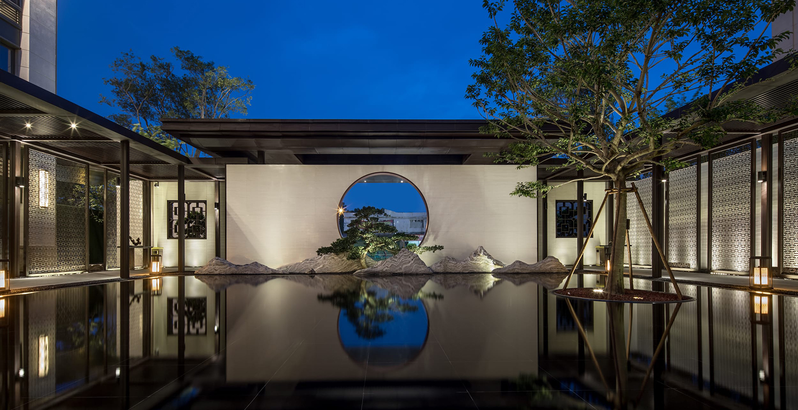 中心水景花園作為中軸核心,東入口向園而行,途徑極具東方雅韻的禪意枯山水,一橋轉折入境,借新中式設計手法,由虛轉實,虛實絞合,將山水理念融匯其中,鏡水回廊營造水天大境,張弛有度的描繪一幅大氣優(yōu)雅的現(xiàn)代山水畫卷。意境脈絡從西入口至中園同樣的上演:穿過屏風、月洞景墻,藏著一片唯美山水畫境:水廊鏡天、松石浮玉皆歸此園。不分遠近,不知高下,月洞之后,更像一個故意的偶然,一點點構建游園的驚喜。
