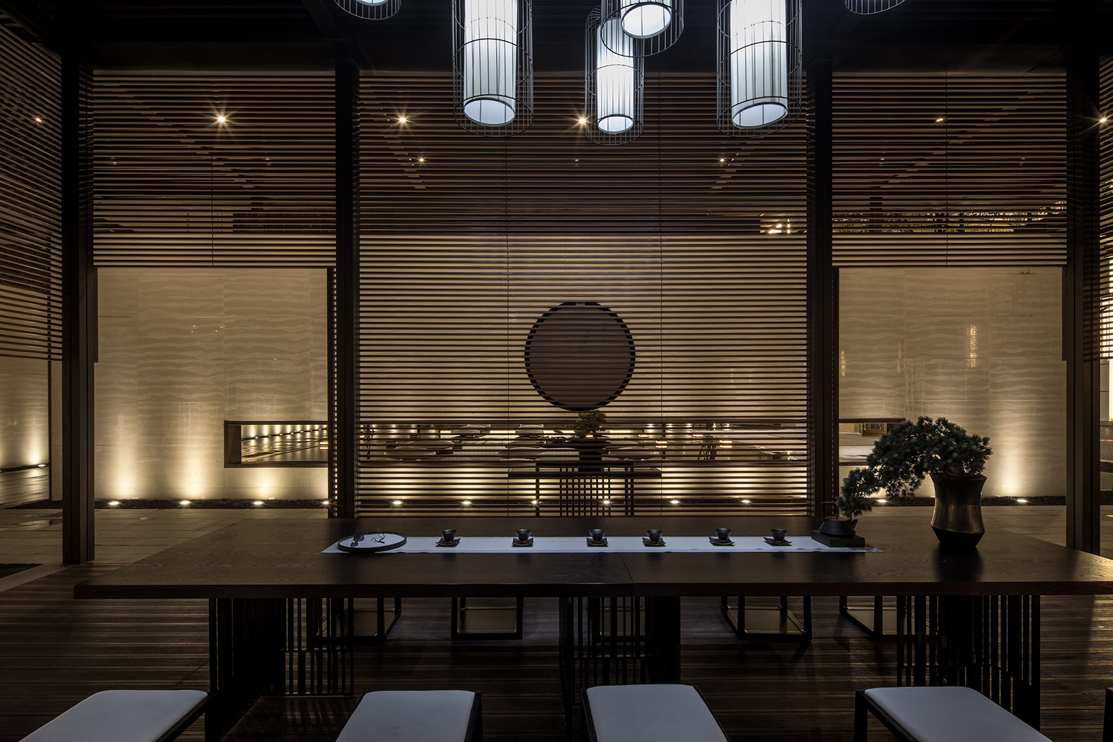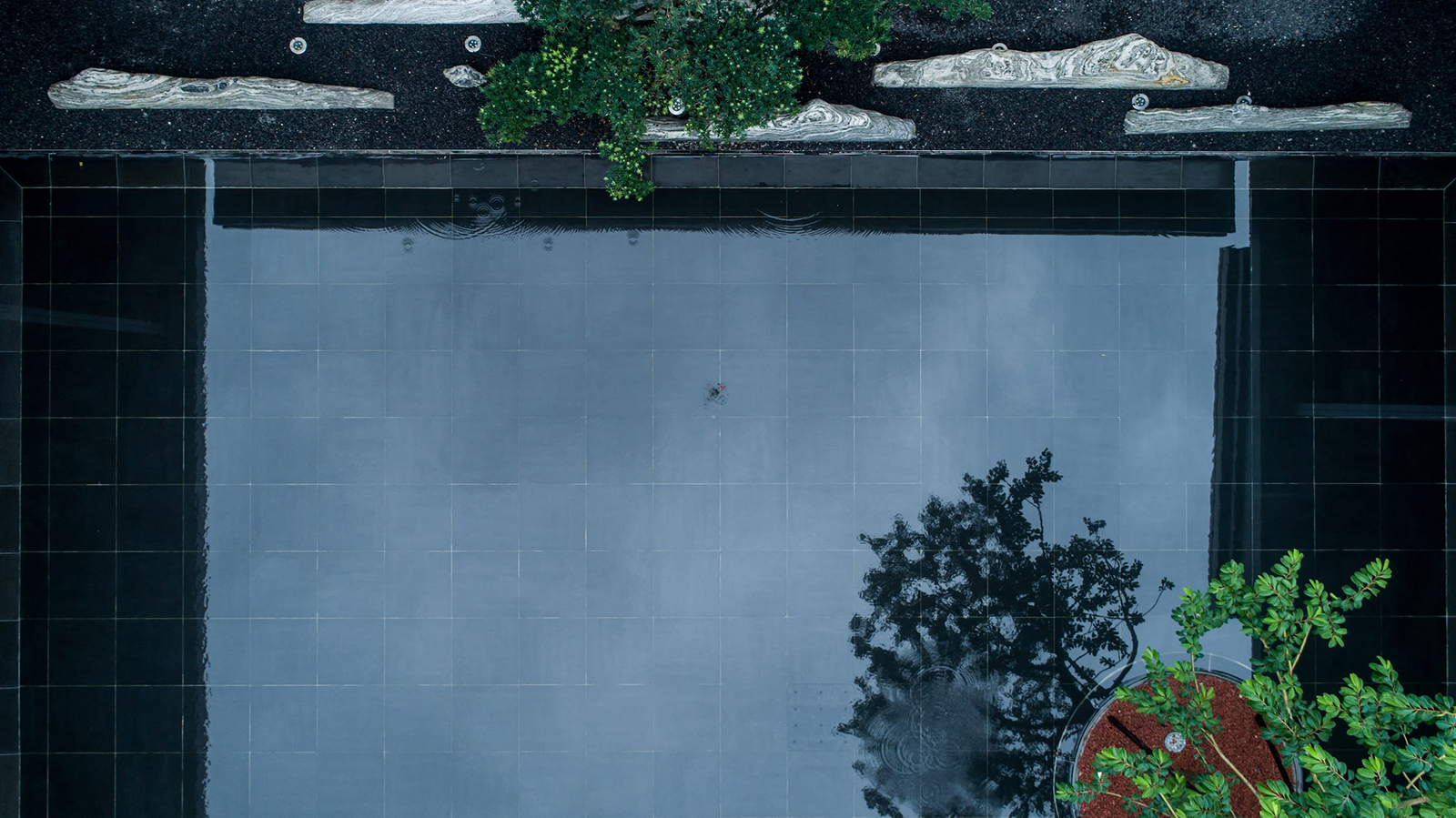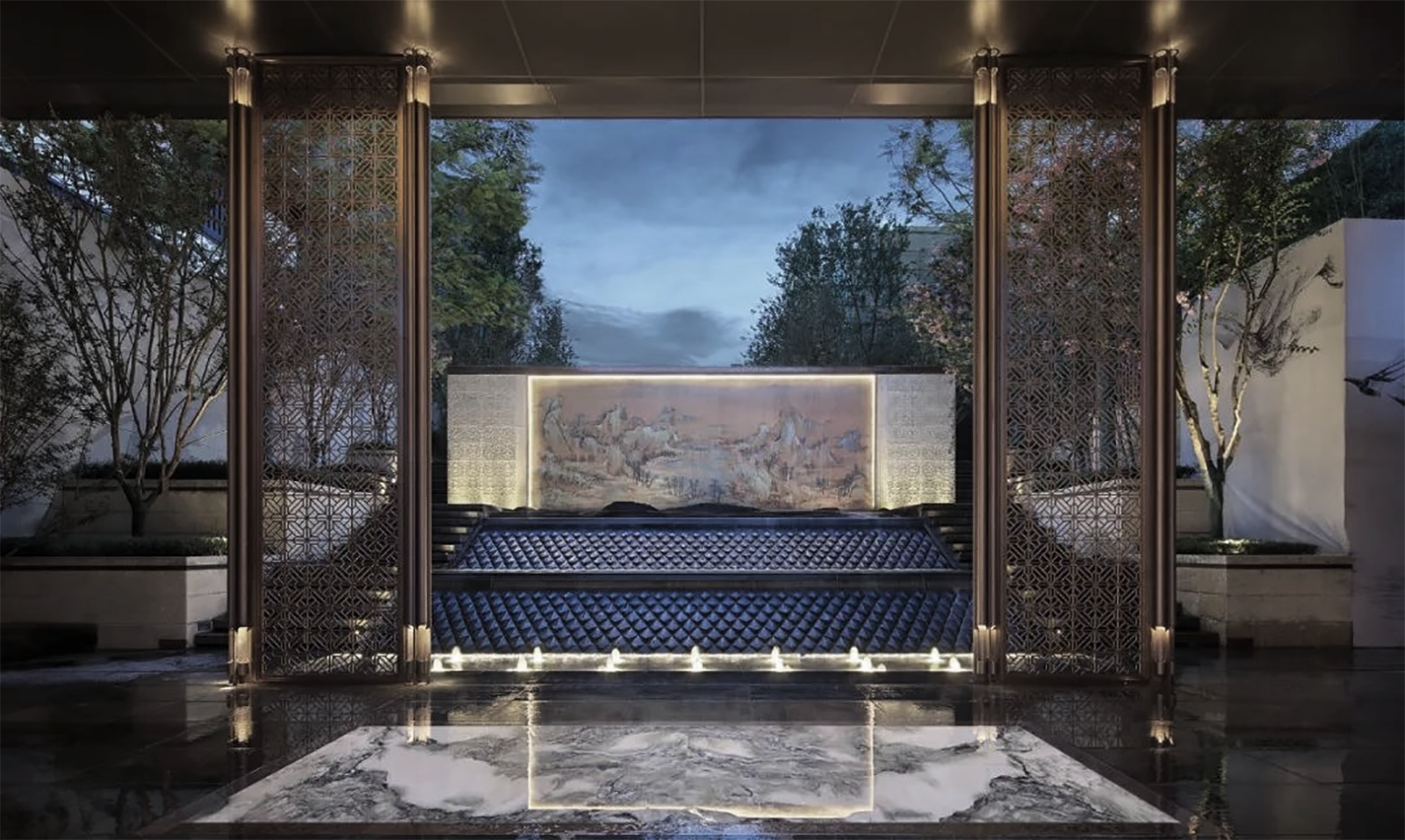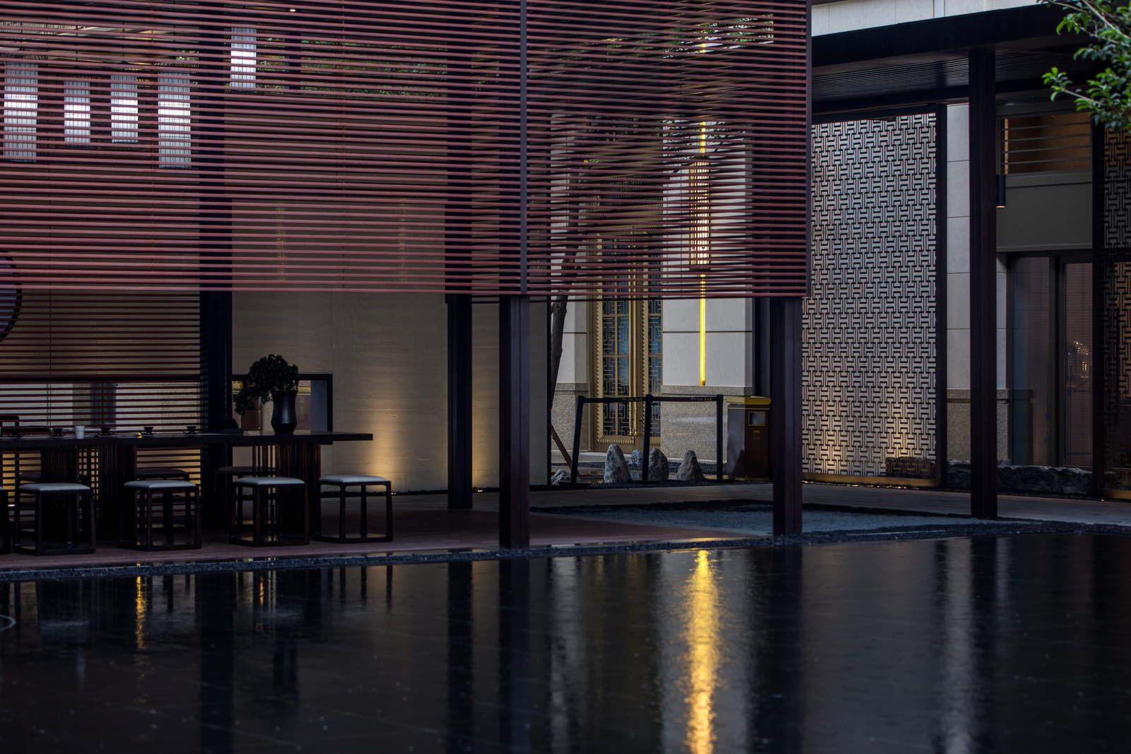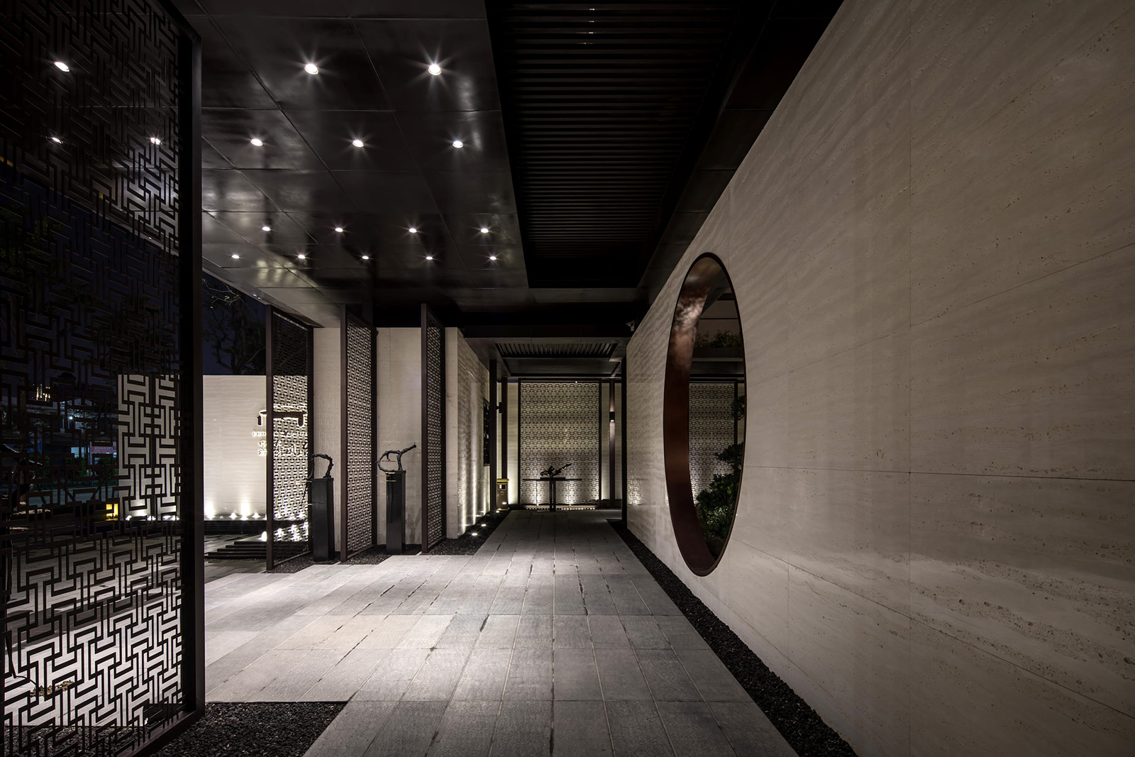 府院境的林泉是文人的林泉,將山水的形意融入到方寸的玉器上是古人表達喜愛的方式。西入口借助5.45米的內外高差,采用六寶歸家禮制,門頭、御燈、光階、疊水、照壁、三山六大景觀元素,禮溯一宅風水,規(guī)制禮儀,疊水瑯瑯如玉鳴,千里江山圖絹畫山水照壁,格柵之后設一池三山枯山水制境,兩側林蔭成趣,猶如境入山林,將臺、池、壁、光影等意境提煉、演化并植入場地,再現(xiàn)一幅具有文人林泉形意的現(xiàn)代山水畫卷。