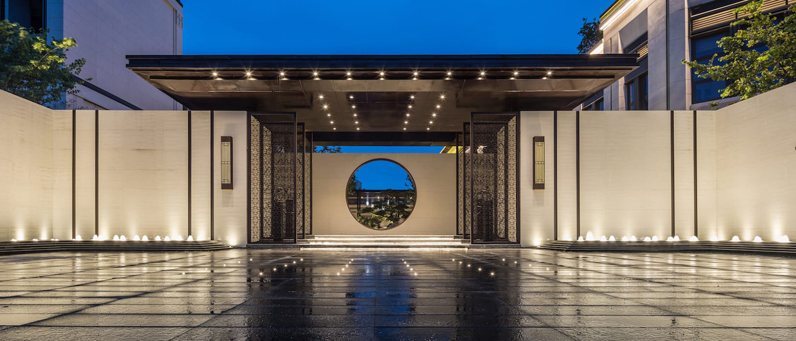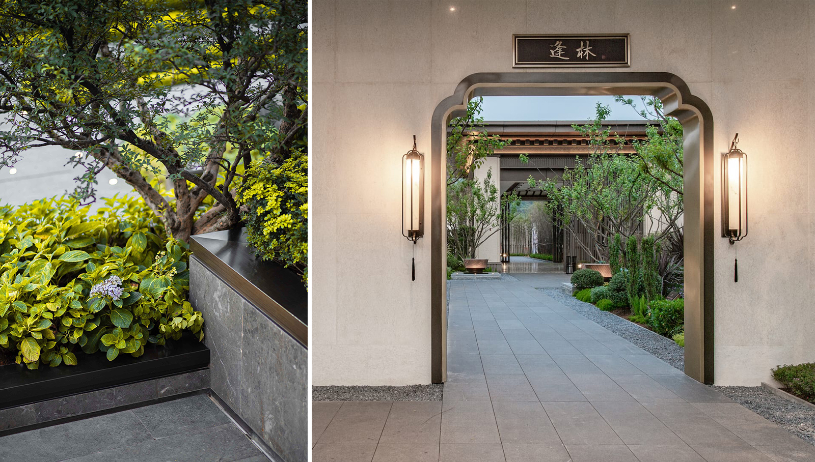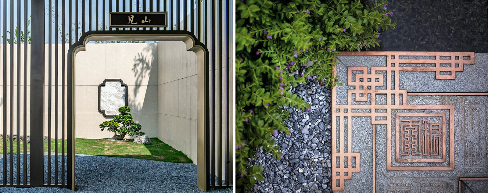居者歸家,表現(xiàn)一個府系主題的入口,通常是厚重的。若想舉重若輕的傳達府園的高貴感,文化意境的融入和儀式感的空間轉換應不可或缺。