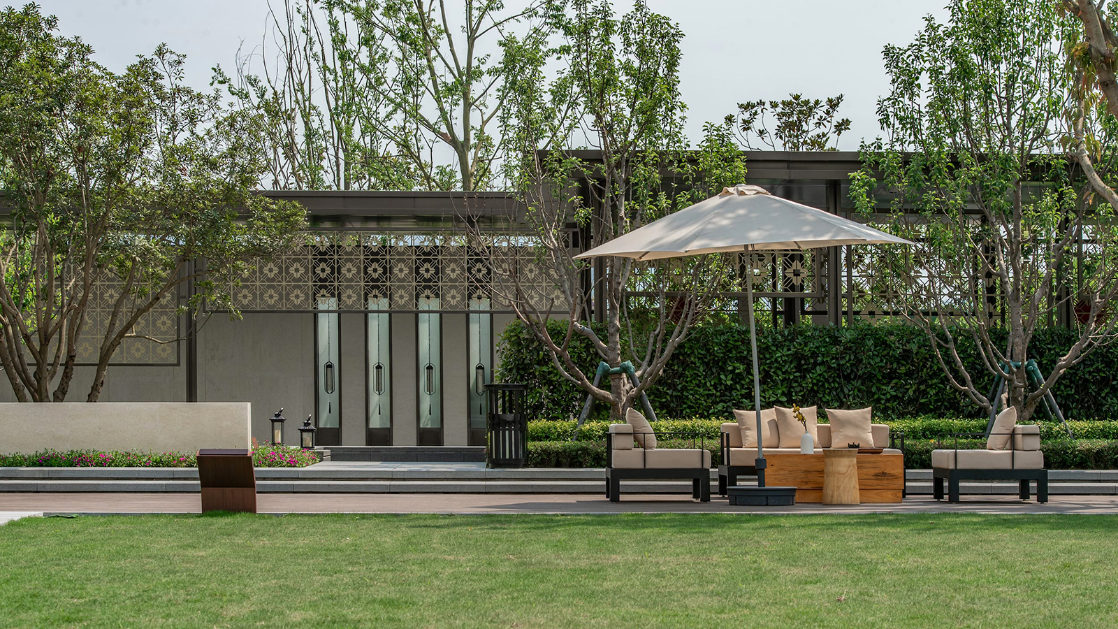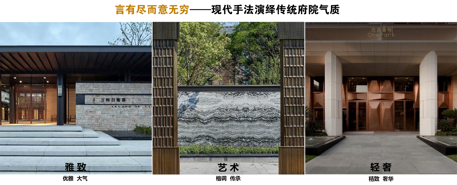 “璽”者:至高無上也,“瑯”從玉,良聲,形容似玉的美石,白玉無暇。汲取“璽瑯”意蘊作為文化主題內涵,并將其提煉為景觀設計元素,以傳統(tǒng)府園文化為基礎,延續(xù)文人園林格局。將“天人合一” 的園林思想融入場地,用現(xiàn)代手法演繹中式格調。在每一進空間中,融入展現(xiàn) “玉石氣質” 的景觀元素,營造人文、境雅的藝術化景觀空間。