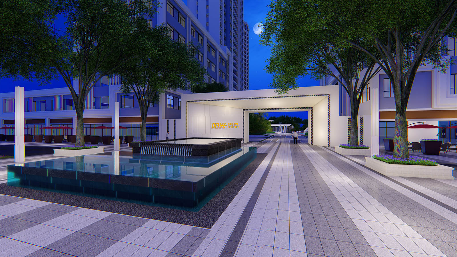 主入口重新梳理原有的商業(yè)車行交通動線,通過林蔭樹陣及景觀燈柱的布置,隔離車行動線,并引導(dǎo)車流由南北兩處車行入口進(jìn)入,入口廣場采用簡雅的設(shè)計手法,保證人行動線安全、流暢,布置鏡面疊水水景,結(jié)合景觀樹陣與燈柱營造禮儀迎賓氛圍,引導(dǎo)業(yè)主悠然歸家。