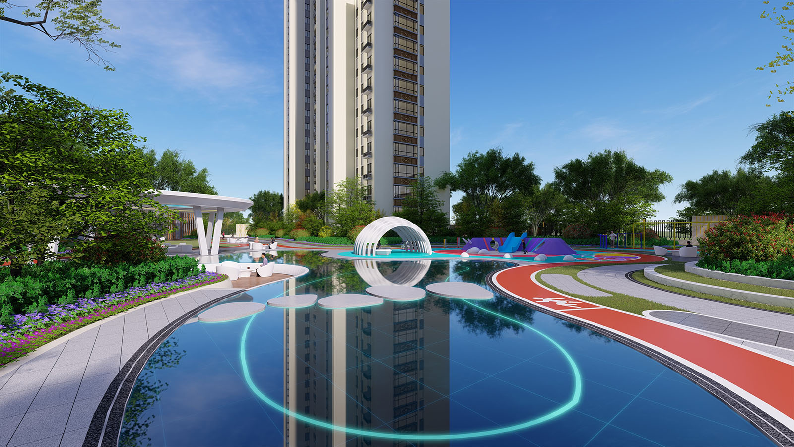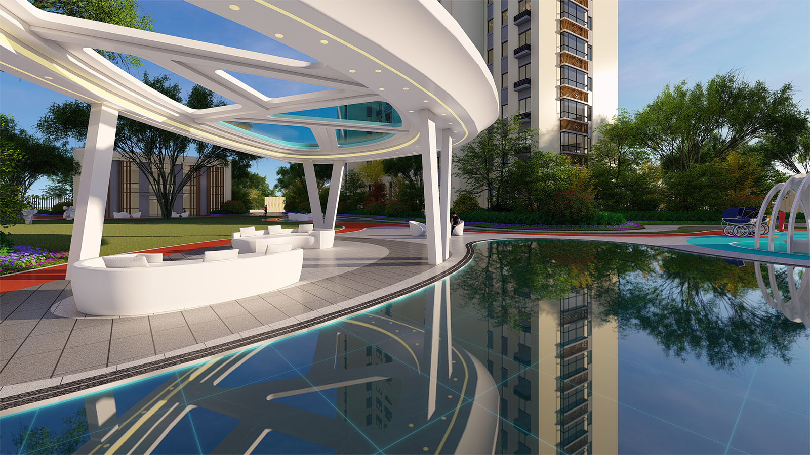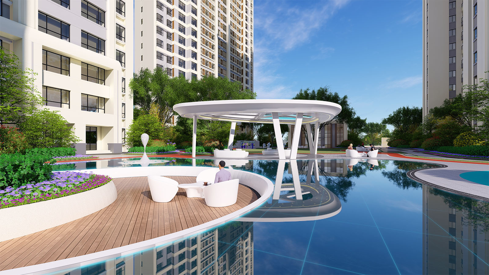 優(yōu)雅靈動的線型、簡潔純凈的色彩語言,富有韻律的構(gòu)圖和曲線形式,表達(dá)各生活功能區(qū)之間相互依纏的空間關(guān)系,線條柔和,以曲線構(gòu)成使的場地更具延展性,采用環(huán)繞式的手法體現(xiàn)出溫潤與舒適的人居氛圍。