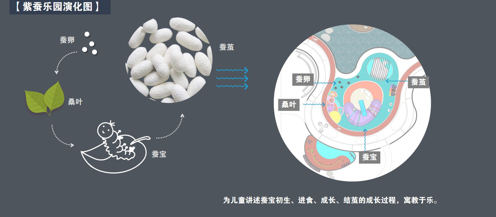 紫蠶兒童主題樂園以蠶寶寶的生長演變過程為設(shè)計思路,整個樂園區(qū)域設(shè)計特別吸引眼球的是以“紫蠶”為主題形象創(chuàng)作的趣味鉆洞滑梯;