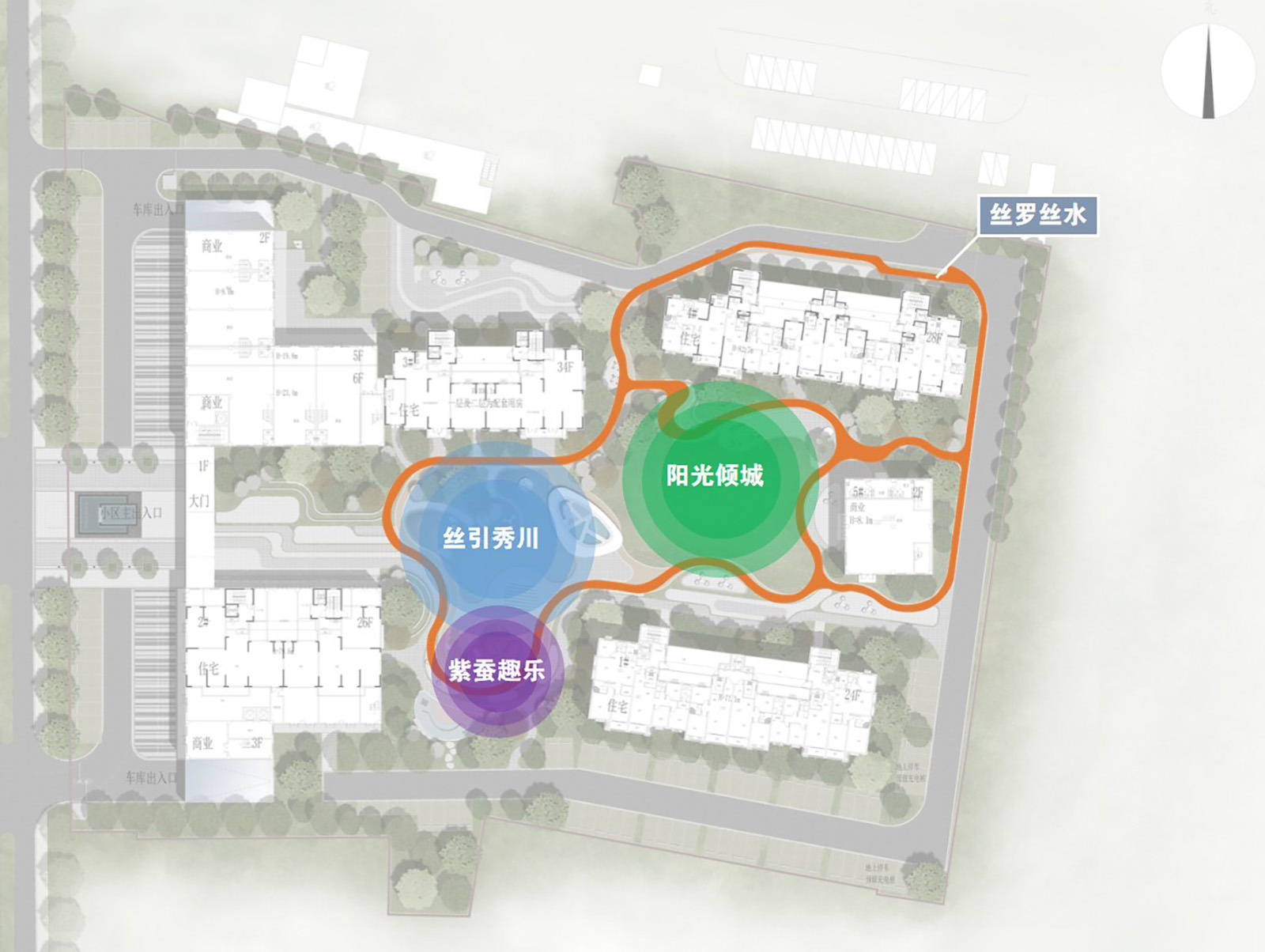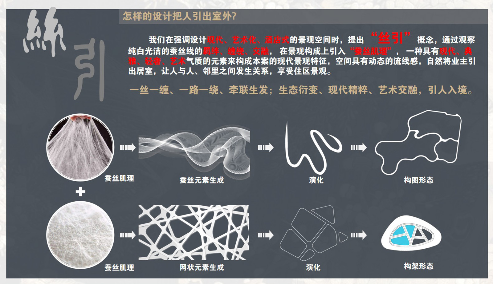 以環(huán)繞式的設(shè)計手法,梳理鏡面水系脈絡(luò),多層絲纏繞、絞合、牽連,往復(fù)不斷,讓觀者在社區(qū)中感受心靈的溫養(yǎng),