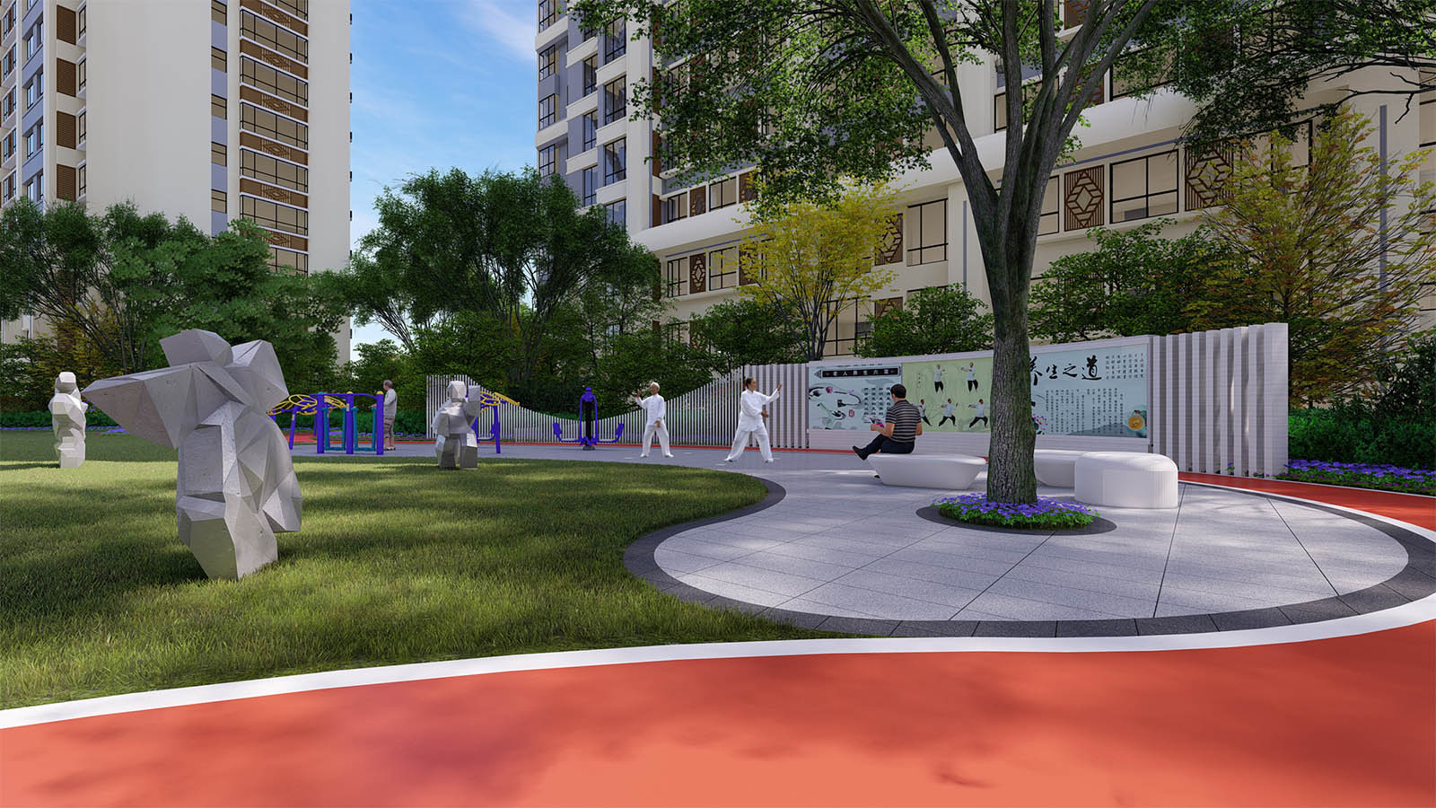太極健身區(qū)設(shè)計太極點位,方便老人展開太極運動,特別為老人設(shè)計了棋牌娛樂空間,方便鄰里間在茶語飯后休閑時間,切磋棋牌游戲