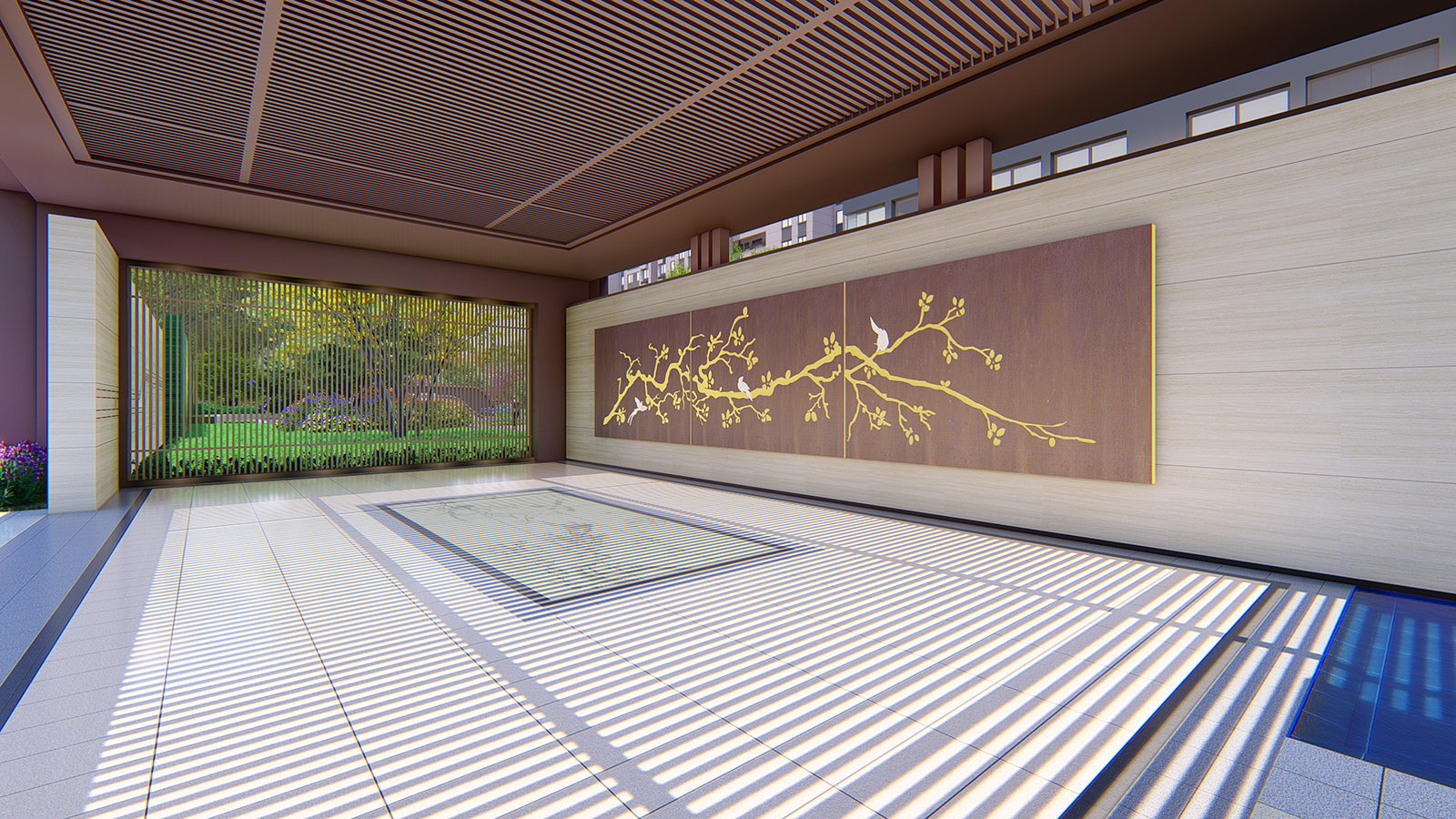 門頭對(duì)景處設(shè)置“喜上眉(梅)梢”景墻,客戶視線跟隨梅花枝條方向延伸,巧妙構(gòu)建空間遞進(jìn)關(guān)系,為項(xiàng)目增添趣味及內(nèi)涵。