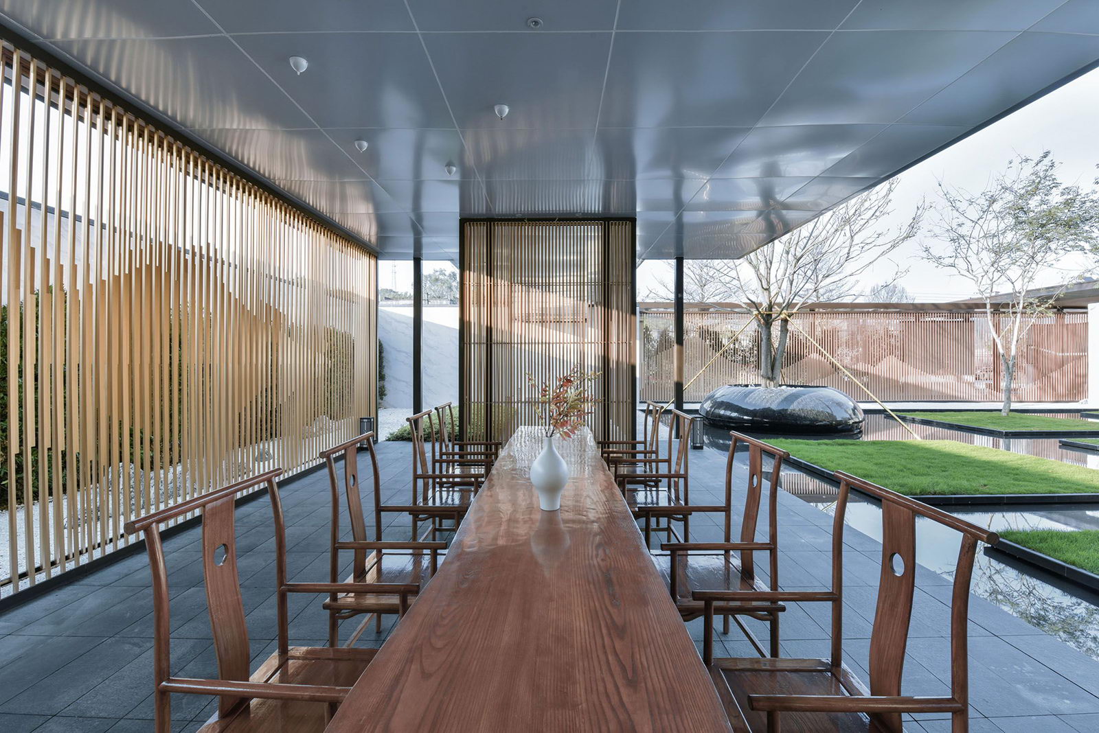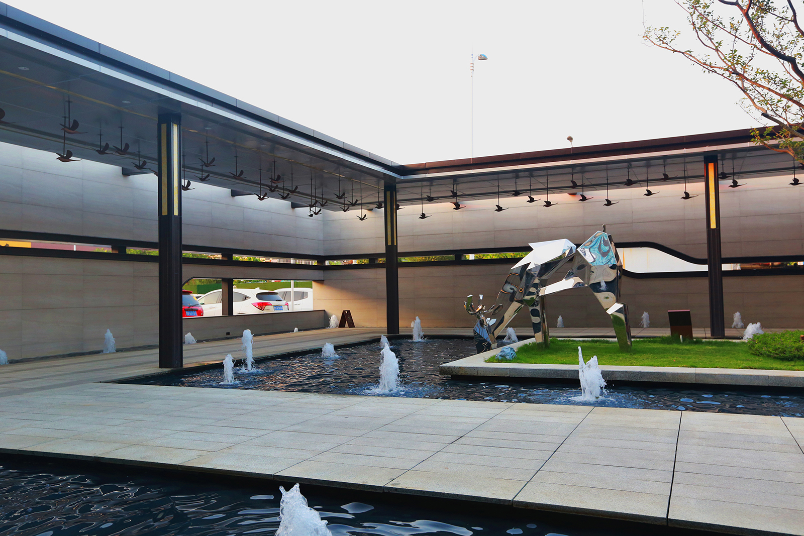 “L形”廊架給予客戶無(wú)形的引導(dǎo),帶領(lǐng)客戶進(jìn)入到更深層次空間,廊架頂板布置喜鵲藝術(shù)裝置,以雀幸喜歸為主題,引導(dǎo)賓客進(jìn)入售樓部。